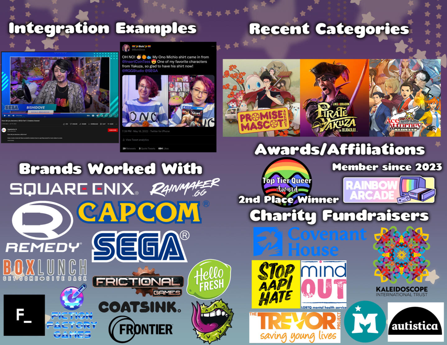 Bishi is interested in working with brands on game promotions through let's plays on Twitch & YouTube (including promotions on social media), sponsorships, product reviews/photos, product promotions on Twitch/YouTube/social media, unboxing products, etc.If you're interested in any of these services, feel free to reach out to Bishi via email (serious business inquiries only):