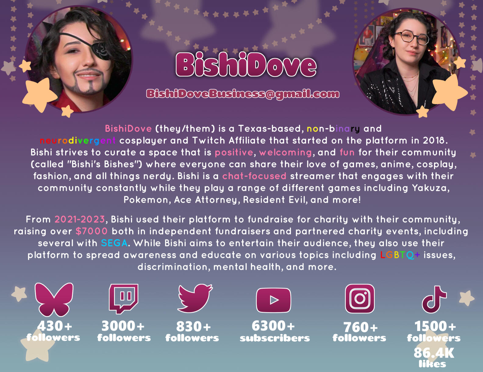 BishiDove (they/them) is a Texas-based Non-Binary and Neurodivergent cosplayer & Twitch Affiliate that started on the platform in 2018. Bishi has built up a community (dubbed "Bishi's Bishes") from the ground up with a dream to create and entertain. They strive to curate a positive, welcoming, and fun space to be in while also sharing a love for video games, anime, cosplay, and all things nerdy. Bishi enjoys many games across several genres. Some of their favorite game series include Yakuza, Legend of Zelda, Pokemon, Ace Attorney, Katamari, Pikmin, and Resident Evil.Bishi and their Bishes have also raised money for charity, over $7,000 total throughout 2021-2023. These charities included individual events Bishi organized, and also events organized by major companies, including SEGA.You can find BishiDove on various social media sites including Twitch, YouTube, and Bluesky.Throne Wishlist